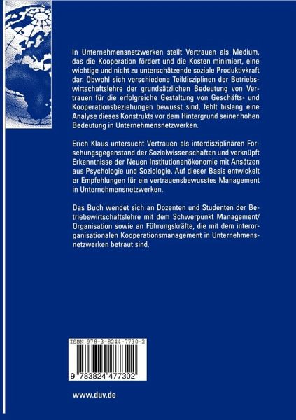 In Unternehmensnetzwerken stellt Vertrauen als Medium, das die Kooperation fördert und die Kosten minimiert, eine wichtige und nicht zu unterschätzende soziale Produktivkraft dar. Obwohl sich verschiedene Teildisziplinen der Betriebswirtschaftslehre der grundsätzlichen Bedeutung von Vertrauen für die erfolgreiche Gestaltung von Geschäfts- und Kooperationsbeziehungen bewusst sind, fehlt bislang eine Analyse dieses Konstrukts vor dem Hintergrund seiner hohen Bedeutung in Unternehmensnetzwerken.