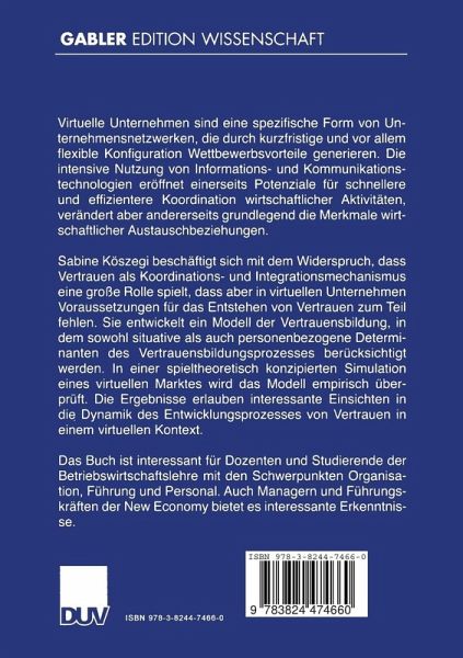 1 Einleitung.- 1.1 Zielsetzung.- 1.2 Aufbau und Struktur.- 2 Begriffsbestimmung.- 3 Merkmale von Virtuellen Unternehmen.- 3.1 Modularität.- 3.2 Heterogenität.- 3.3 Elektronische Netzwerkintegration.- 3.4 Vertrauen.- 3.4.1 Verzicht auf die Institutionalisierung von Koordination.- 3.4.2 Vertrauen als Koordinationsmechanismus.- 4 Rolle und Funktion von Vertrauen.- 4.1 Vertrauen als Koordinations- und Kontrollmechanismus.- 4.1.1 Steuerung von Verhalten.- 4.1.2 Überwachung von Verhalten.- 4.1.3 Kritik an Vertrauen als Koordinations- und Kontrollmechanismus.- 4.1.4 Zusammenfassung.- 4.2 Vertrauen als Mechanismus zur Reduktion von Unsicherheit.- 4.2.1 Unsicherheit und persönliches Vertrauen.- 4.2.2 Unsicherheit und Systemvertrauen.- 4.3 Ableitung einer funktionalen Definition von Vertrauen.- 5 Der Vertrauensbildungsprozess.- 5.1 Zeit.- 5.2 Vertrauensfördernde Eigenschaften der Personen.- 5.3 Kommunikation.- 5.4 Situation.- 6 Das TRISK-Modell.- 6.1 Die Wahrnehmung der Risikohöhe.- 6.1.1 Bewertung des situativen Risikos.- 6.1.2 Bewertung des sozialen Risikos.- 6.2 Der Einfluss der Risikoneigung auf das Verhalten.- 6.3 Die Entwicklung von persönlichem Vertrauen.- 7 Experiment: Virtueller Kautschukmarkt.- 7.1 Einleitung.- 7.2 Design.- 7.3 Versuchspersonen.- 7.4 Vorgangsweise.- 7.5 Variablen.- 7.5.1 Personenbezogene Faktoren.- 7.5.2 Situative Faktoren.- 7.5.3 Abhängige Variablen.- 7.5.4 Übrige Ergebnisvariablen.- 8 Ergebnisse.- 8.1 Wahrnehmung des Risikos.- 8.2 Die Wirkung des Preises auf das wahrgenommene Risiko.- 8.3 Verhalten.- 8.4 Die Entwicklung von persönlichem Vertrauen.- 8.5 Zusammenfassung und Diskussion der Ergebnisse.- 9 Ausblick.