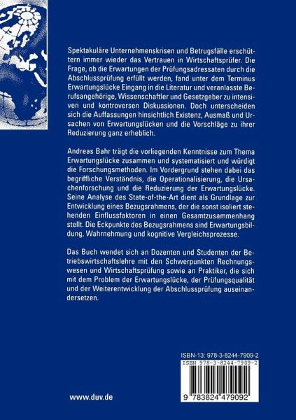 Andreas Bahr trägt die vorliegenden Kenntnisse zum Thema Erwartungslücke zusammen und systematisiert und würdigt die Forschungsmethoden. Im Vordergrund stehen dabei das begriffliche Verständnis, die Operationalisierung, die Ursachenforschung und die Reduzierung der Erwartungslücke. Seine Analyse des State-of-the-Art dient als Grundlage zur Entwicklung eines Bezugsrahmens, der die sonst isoliert stehenden Einflussfaktoren in einen Gesamtzusammenhang stellt. Die Eckpunkte des Bezugsrahmens sind Erwartungsbildung, Wahrnehmung und kognitive Vergleichsprozesse.