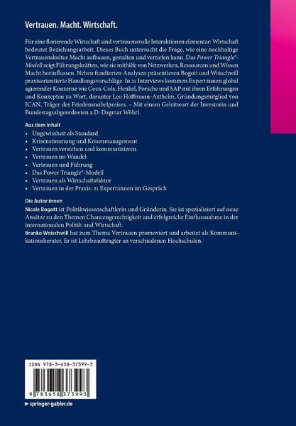 Für eine florierende Wirtschaft sind vertrauensvolle Interaktionen elementar: Wirtschaft bedeutet Beziehungsarbeit. Dieses Buch untersucht die Frage, wie eine nachhaltige Vertrauenskultur Macht aufbauen, gestalten und vertiefen kann. Das Power Triangle®-Modell zeigt Führungskräften, wie sie mithilfe von Netzwerken, Ressourcen und Wissen Macht beeinflussen. Neben fundierten Analysen präsentieren Bogott und Woischwill praxisorientierte Handlungsvorschläge. In 21 Interviews kommen Expert:innen global agierender Konzerne wie Coca-Cola, Henkel, Porsche und SAP mit ihren Erfahrungen und Konzepten zu Wort, darunter Leo Hoffmann-Axthelm, Gründungsmitglied von ICAN, Träger des Friedensnobelpreises. - Mit einem Geleitwort der Investorin und Bundestagsabgeordneten a.D. Dagmar Wöhrl.