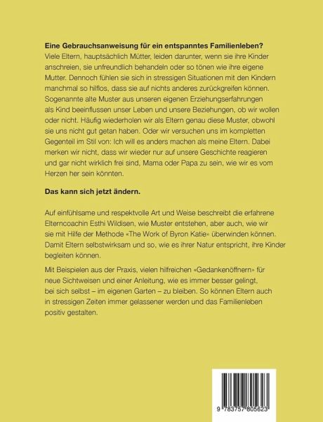 Eine Gebrauchsanweisung für ein entspanntes Familienleben?Viele Eltern, hauptsächlich Mütter, leiden darunter, wenn sie ihre Kinder anschreien, sie unfreundlich behandeln oder so tönen wie ihre eigene Mutter. Dennoch fühlen sie sich in stressigen Situationen mit den Kindern manchmal so hilflos, dass sie auf nichts anderes zurückgreifen können. Sogenannte alte Muster aus unseren eigenen Erziehungserfahrungen als Kind beeinflussen unser Leben und unsere Beziehungen, ob wir wollen oder nicht. Häufig wiederholen wir als Eltern genau diese Muster, obwohl sie uns nicht gut getan haben. Oder wir versuchen uns im kompletten Gegenteil im Stil von: Ich will es anders machen als meine Eltern. Dabei merken wir nicht, dass wir wieder nur auf unsere Geschichte reagieren und gar nicht wirklich frei sind, Mama oder Papa zu sein, wie wir es vom Herzen her sein könnten.Das kann sich jetzt ändern. Auf einfühlsame und respektvolle Art und Weise beschreibt die erfahrene Elterncoachin Esthi Wildisen, wie Muster entstehen, aber auch, wie wir sie mit Hilfe der Methode The Work of Byron Katie überwinden können. Damit Eltern selbstwirksam und so wie es ihrer Natur entspricht, ihre Kinder begleiten können.Mit Beispielen aus der Praxis, vielen hilfreichen «Gedankenöffnern» für neue Sichtweisen, und einer Anleitung, wie es immer besser gelingt, bei sich selbst - im eigenen Garten - zu bleiben. So können Eltern auch in stressigen Zeiten immer gelassener bleiben und das Familienleben positiv gestalten.