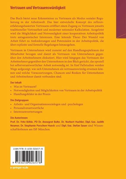 Vertrauen in Unternehmen wird zumeist auf den Handlungsspielraum der Mitarbeiter bezogen und damit als Vertrauen von Unternehmen gegenüber den Arbeitnehmern diskutiert. Hier wird hingegen das Vertrauen der Arbeitnehmer gegenüber den Unternehmen in den Blick gerückt, das speziell bei selbstverantwortlicher Arbeit notwendig ist. In fünf Fallstudien werden Wege aufgezeigt, wie sich Unternehmen als vertrauenswürdig erweisen können und welche Voraussetzungen, Chancen und Risiken für Unternehmen und Arbeitnehmer damit verbunden sind.