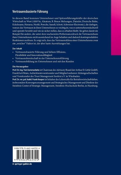 In diesem Band kommen Unternehmer und Spitzenführungskräfte der deutschen Wirtschaft zu Wort (AbbVie, Alnatura, B. Braun Melsungen, Daimler, Deutsche Bahn, Eckelmann, Heraeus, Nestlé, Porsche, Sanofi, Schott, Schweizer Electronic), die darlegen, warum das Vertrauen in ihren Unternehmen so wichtig ist, was es unternehmenskulturell und operativ bewirkt und wie sie sicher stellen, dass es erhalten bleibt. Sie geben damit ein Beispiel für andere, die unter dem wachsenden Performancedruck die Vertrauensbasis ihres Unternehmens nicht ausreichend im Auge behalten und dadurch kontraproduktive Reaktionen auslösen. Es zeigt sich, dass das Vertrauensklima eines Unternehmens zwar ein "weicher" Faktor ist, der aber harte Auswirkungen hat.