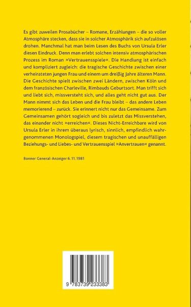 Es gibt zuweilen Romane die so voller Atmosphäre stecken, dass sie in solcher Atmosphärik sich aufzulösen drohen. Manchmal hat man beim Lesen des Buchs von Ursula Erler diesen Eindruck. Denn man erlebt solchen intensiv atmosphärischen Prozess im Roman Vertrauensspiele. Die Handlung ist einfach und kompliziert zugleich: die tragische Geschichte zwischen einer verheirateten jungen Frau und einem um dreißig Jahre älteren Mann. Die Geschichte spielt zwischen zwei Ländern, zwischen Köln und dem französischen Charleville, Rimbauds Geburtsort. Man trifft sich und liebt sich, missversteht sich, und alles geht nicht gut aus. Der Mann nimmt sich das Leben und die Frau bleibt, das andere Leben memorierend, zurück. Sie erinnert nicht nur das Gemeinsame. Zum Gemeinsamen gehört sogleich und bis zuletzt das Missverstehen, das einander nicht erreichen. Dieses Nicht-Erreichbare wird von Ursula Erler in ihrem überaus lyrisch, sinnlich, empfindlich wahrgenommenen Monologspiel, diesem tragischen undunauffälligen Beziehungs- und Liebes- und Vertrauensspiel Anvertrauen genannt.