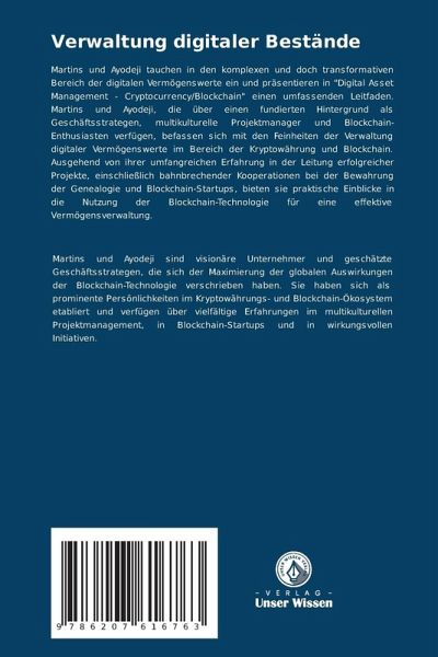 Martins und Ayodeji tauchen in den komplexen und doch transformativen Bereich der digitalen Vermögenswerte ein und präsentieren in "Digital Asset Management - Cryptocurrency/Blockchain" einen umfassenden Leitfaden. Martins und Ayodeji, die über einen fundierten Hintergrund als Geschäftsstrategen, multikulturelle Projektmanager und Blockchain-Enthusiasten verfügen, befassen sich mit den Feinheiten der Verwaltung digitaler Vermögenswerte im Bereich der Kryptowährung und Blockchain. Ausgehend von ihrer umfangreichen Erfahrung in der Leitung erfolgreicher Projekte, einschließlich bahnbrechender Kooperationen bei der Bewahrung der Genealogie und Blockchain-Startups, bieten sie praktische Einblicke in die Nutzung der Blockchain-Technologie für eine effektive Vermögensverwaltung.