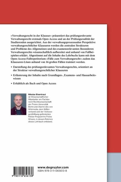 "Verwaltungsrecht in der Klausur" präsentiert das prüfungsrelevante Verwaltungsrecht erstmals Open Access und an der Prüfungsrealität der Studierenden ausgerichtet. Die Darstellung orientiert sich dabei an der typischen Struktur verwaltungsrechtlicher Klausuren; das relevante Wissen und die zu beherrschenden Streitstände werden als Elemente der gutachterlichen Darstellung erläutert. Ausgehend von der verwaltungsprozessualen Einkleidung werden die zentralen Strukturen und Probleme des allgemeinen Verwaltungsrechts und des examensrelevanten Besonderen Verwaltungsrechts wissenschaftlich an den klausurrelevanten Stellen aufbereitet. Die Ausführungen berücksichtigen zudem das individuelle Lernniveau, indem zwischen Grundlagen-, Examens- und Hausarbeitswissen unterschieden wird. Beispiele runden die Darstellung ab.