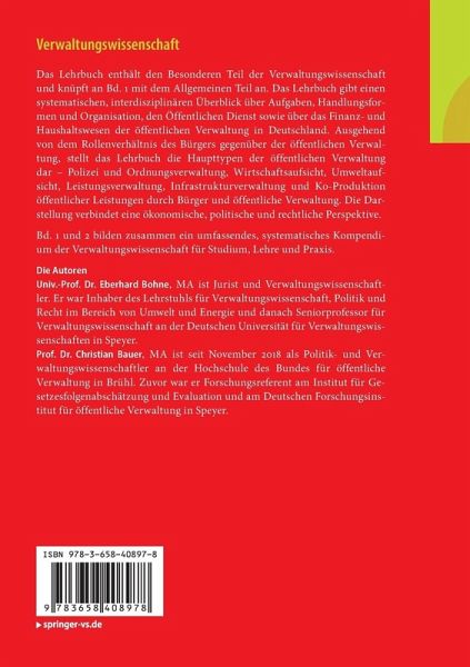 Das Lehrbuch enthält den Besonderen Teil der Verwaltungswissenschaft und knüpft an Bd. 1 mit dem Allgemeinen Teil an. Das Lehrbuch gibt einen systematischen, interdisziplinären Überblick über Aufgaben, Handlungsformen und Organisation, den Öffentlichen Dienst sowie über das Finanz- und Haushaltswesen der öffentlichen Verwaltung in Deutschland. Ausgehend von dem Rollenverhältnis des Bürgers gegenüber der öffentlichen Verwaltung, stellt das Lehrbuch die Haupttypen der öffentlichen Verwaltung dar - Polizei und Ordnungsverwaltung, Wirtschaftsaufsicht, Umweltaufsicht, Leistungsverwaltung, Infrastrukturverwaltung und Ko-Produktion öffentlicher Leistungen durch Bürger und öffentliche Verwaltung. Die Darstellung verbindet eine ökonomische, politische und rechtliche Perspektive. Bd. 1 und 2 bilden zusammen ein umfassendes, systematisches Kompendium der Verwaltungswissenschaft für Studium, Lehre und Praxis.