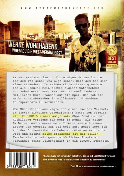 Es war verdammt knapp. Vor einigen Jahren konnte ich dem Tod genau ins Auge sehen. Seitdem hat sich alles verändert. In meinem Kinderzimmer gründete ich als Schüler mein erstes eigenes Unternehmen und scheiterte. Dann kam ich der wohl nächsten Milliarden-Euro-Branche auf die Spur. Sie hat die Macht, Schulabbrecher in Millionäre und Joblose in Superstars zu verwandeln. Vom Küchentisch aus wagte ich einen zweiten Versuch. Im ersten richtigen Geschäftsjahr hatte ich bereits ein 120.000EUR-Business aufgebaut. Ohne Studium oder Ausbildung verdiene ich mehr im Monat, als meine Ex-Lehrer und steuere mein Unternehmen mit einem Laptop von überall auf der Welt aus. Heute lebe ich auf der Sonnenseite des Lebens, reise an exotische Orte und möchte meine Erfahrung mit dir teilen. Tauche ein in mein ganz persönliches Abenteuer. Verwandle deine Leidenschaft in ein 120.000-Business.