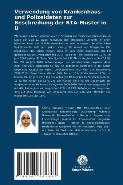 Wie in allen Ländern nehmen auch in Sansibar die Straßenverkehrsunfälle im Laufe der Zeit zu, wobei Fahrzeuge des öffentlichen Verkehrs in einen höheren Anteil der Unfälle verwickelt zu sein scheinen. Die öffentlichen Verkehrsmittel befördern jedoch eine große Anzahl von Fahrgästen. Die Ergebnisse der Studie zeigen, dass im Jahr 2009 insgesamt 583 FTI gemeldet wurden, verglichen mit 2010 (692 FTI) - ein Anstieg um 19 %. Im Jahr 2009 gab es 55 Todesfälle (9,4 %) bei 583 FTI im Vergleich zu 54 (7,8 %) bei 692 im Jahr 2010. Aufzeichnungen der Verkehrspolizei ergaben, dass 2009 und 2010 insgesamt 55 bzw. 54 Todesfälle durch RTA in der Stadt Unguja zu verzeichnen waren. Unfallaufnahme nach Alter und Geschlecht, 2009-2010 - Erwachsene Männer 66%, Frauen 10%, Kinder Männer 17% und Frauen 7%. Im Jahr 2010 lag der Anteil der Männer bei 65 %, der Frauen bei 13 %, der Kinder bei 12 % und der Männer bei 8 %. Die Gesamtzahl der aufgenommenen Fälle nach Kategorien 2009-2010: Fahrer von insgesamt 3% auf 4%; Passagiere von insgesamt 17% auf 23%; Fußgänger von insgesamt 39% auf 35%; Motorrad von insgesamt 24% auf 23% und Fahrräder von insgesamt 18% auf 15%.