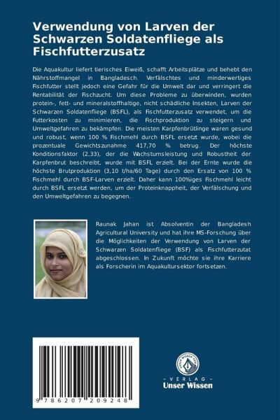 Die Aquakultur liefert tierisches Eiweiß, schafft Arbeitsplätze und behebt den Nährstoffmangel in Bangladesch. Verfälschtes und minderwertiges Fischfutter stellt jedoch eine Gefahr für die Umwelt dar und verringert die Rentabilität der Fischzucht. Um diese Probleme zu überwinden, wurden protein-, fett- und mineralstoffhaltige, nicht schädliche Insekten, Larven der Schwarzen Soldatenfliege (BSFL), als Fischfutterzusatz verwendet, um die Futterkosten zu minimieren, die Fischproduktion zu steigern und Umweltgefahren zu bekämpfen. Die meisten Karpfenbrütlinge waren gesund und robust, wenn 100 % Fischmehl durch BSFL ersetzt wurde, wobei die prozentuale Gewichtszunahme 417,70 % betrug. Der höchste Konditionsfaktor (2,33), der die Wachstumsleistung und Robustheit der Karpfenbrut beschreibt, wurde mit BSFL erzielt. Bei der Ernte wurde die höchste Brutproduktion (3,10 t/ha/60 Tage) durch den Ersatz von 100 % Fischmehl durch BSF-Larven erzielt. Daher kann 100%iges Fischmehl leicht durch BSFL ersetzt werden, um der Proteinknappheit, der Verfälschung und den Umweltgefahren zu begegnen.