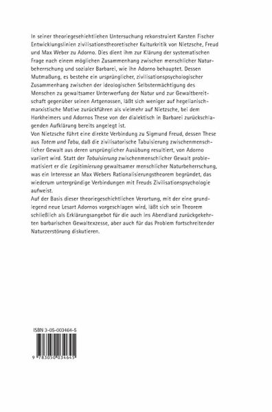 In seiner theoriegeschichtlichen Untersuchung rekonstruiert Karsten Fischer Entwicklungslinien zivilisationstheoretischer Kulturkritik von Nietzsche, Freud und Max Weber zu Adorno. Dies dient ihm zur Klärung der systematischen Frage nach einem möglichen Zusammenhang zwischen menschlicher Naturbeherrschung und sozialer Mutmaßung, dass ein ursprünglicher, zivilisationspsychologischer Zusammenhang zwischen der ideologischen Selbstermächtigung des Menschen zu gewaltsamer Unterwerfung der Natur und seiner Gewaltbereitschaft gegenüber seinen Artgenossen besteht, lässt sich weniger auf hegelianisch-marxistische Motive zurückführen als vielmehr auf Nietzsche, bei dem Horkheimers und Adornos These von der dialektisch in Barbarei zurückschlagenden Aufklärung bereits angelegt ist. Von Nietzsche führt eine direkte Verbindung zu Sigmund Freud, dessen These, dass die zivilisatorische Tabuisierung zwischenmenschlicher Gewalt aus deren ursprünglicher Ausübung resultiert, von Adorno variiert wird. Statt der 'Tabuisierung' zwischenmenschlicher Gewalt problematisiert er die 'Legitimierung" gewaltsamer menschlicher Naturbeherrschung, was ein Interesse an Webers Rationalisierungstheorem begründet, das untergründige Verbindungen mit Freuds Zivilisationspsychologie aufweist. Auf der Basis dieser theoriegeschichtlichen Verortung, mit der eine grundlegend neue Lesart Adornos vorgeschlagen wir, lässt sich sein Theorem schließlich als Erklärungsangebot für die auch ins Abendland zurückgekehrten barbarischen Gewaltexzesse wie auch für das Problem fortschreitender Naturzerstörung diskutieren.
