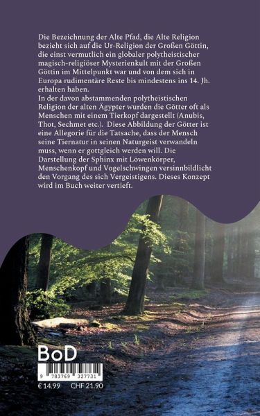 Die Bezeichnung der Alte Pfad, die Alte Religion bezieht sich auf die Ur-Religion der Großen Göttin, die einst vermutlich ein globaler polytheistischer magisch-religiöser Mysterienkult mit der Großen Göttin im Mittelpunkt war und von dem sich in Europa rudimentäre Reste bis mindestens ins 14. Jh. erhalten haben. In der davon abstammenden polytheistischen Religion der alten Ägypter wurden die Götter oft als Menschen mit einem Tierkopf dargestellt (Anubis, Thot, Sechmet etc.). Diese Abbildung der Götter ist eine Allegorie für die Tatsache, dass der Mensch seine Tiernatur in seinen Naturgeist verwandeln muss, wenn er gottgleich werden will. Die Darstellung der Sphinx mit Löwenkörper, Menschenkopf und Vogelschwingen versinnbildlicht den Vorgang des sich Vergeistigens. Diesem Gedanken unter anderen wird hier im Buch weiter nachgegangen.