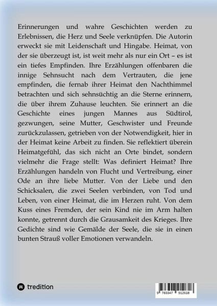 Mein Buch dreht sich um das Thema Heimat und das Gefühl, irgendwo verwurzelt zu sein. Es enthält wahre Geschichten aus eigener Erfahrung und Erzählungen Betroffener. Es behandelt die tiefen Gefühle von Heimat, spricht von der Sehnsucht nach einem Ort der Geborgenheit und der schmerzlichen Erfahrung der Heimatlosigkeit. Die Verbundenheit zur Heimaterde und das tiefe Gefühl, das wir mit dem Begriff Heimat verbinden, stehen im Mittelpunkt. Es geht um Heimat als den Ort, an dem das Herz schlägt, und um die schmerzliche Erfahrung, aus der Heimat vertrieben zu werden. Jede Geschichte in diesem Buch ist ein Zeugnis der Kraft und des Mutes, den Menschen aufbringen, um ihre Wurzeln zu finden und zu bewahren, auch wenn sie weit weg von ihrem ursprünglichen Zuhause sind.Es erinnert an die Geschichte eines jungen Mannes aus Südtirol, gezwungen, seine Mutter, Geschwister und Freunde zurückzulassen, getrieben von der Notwendigkeit, das fehlende Geld zu ersetzen. Es reflektiert über ein Heimatgefühl, das sich nicht an Orte bindet, sondern vielmehr die Frage stellt: Was definiert Heimat? Eine Erzählung von Flucht und Vertreibung, eine Ode an die Mutter. Von der Liebe und den Schicksalen, die zwei Seelen verbinden, von Tod und Leben, von einer Heimat, die im Herzen ruht. Von dem Kuss eines Fremden, der sein Kind nie im Arm halten konnte, getrennt durch die Grausamkeit des Krieges. Die Gedichte sind wie Gemälde in einem bunten Strauß voller Emotionen.