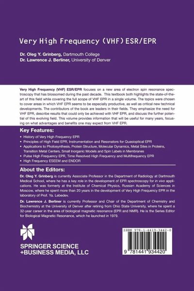 The field of Very High Frequency EPR (VHF EPR) or sometimes called Very High Field EPR (conveniently, also abbreviated as VHF EPR) has blossomed during the past decade, especially after the original pioneering work of Ya. S. Lebedev and his group at the Institute of Chemical Physics, Russian Academy of Sciences in Moscow. Although Lebedev suffered heavily under the economic constraints of the communist Soviet Union and then succumbed to cancer at the peak of his scientific career, his groundbreaking work from the 1970's is still considered today to be the 'gold standard' by researchers practicing EPR at high magnetic fields. A stimulus for the production of this book is the legacy of Yakov Levedev in his students now residing in academic positions in the US and elsewhere. The aim of this book is to highlight the state of this growing field. This is an attempt to cover the full scope of VHF EPR in a single volume. The idea for this volume came to the editors at the 2001 Rocky Mountain Analytical Conference during the 24th International EPR Symposium chaired by Sandra and Gareth Eaton. VHF EPR was presented as an independent research field at a workshop organized by LC BruneI and supported by the National High Magnetic Field Laboratory, a National Science Foundation funded facility at Florida State University.