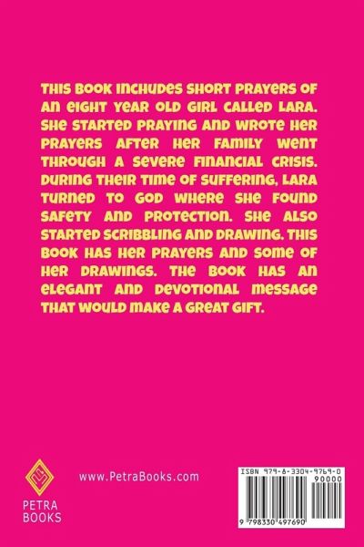 This book inchudes short prayers of an eight year old girl called Lara. She started praying and wrote her prayers after her family went through a severe financial crisis. During their time of suffering, Lara turned to God where she found safety and protection. She also started scribbling and drawing. This book has her prayers and some of her drawings. The book has an elegant and devotional message that would make a great gift.