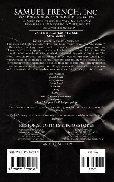 This second collection of short plays from Steve Yockey mixes comedic absurdity with raw heartbreak to unearth worlds populated by desperate people, mythical characters, faceless corporate masters, and at least one Slasher flick heroine. The second half of the collection is comprised of the work very still & hard to see. This short play cycle recounts the history of a cursed hotel and the unfortunate guests who stay there. From riding in an erratic elevator and dealing with possessive ghosts to