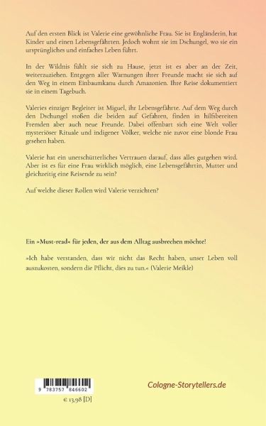 Auf den ersten Blick ist Valerie eine gewöhnliche Frau. Sie ist Engländerin, hat Kinder und einen Lebensgefährten. Jedoch wohnt sie im Dschungel, wo sie ein ursprüngliches, einfaches Leben führt. In der Wildnis fühlt sie sich zu Hause, jetzt ist es aber an der Zeit, weiterzuziehen. Entgegen aller Warnungen ihrer Freunde macht sie sich auf den Weg in einem Einbaumkanu durch Amazonien. Ihre Reise dokumentiert sie in einem Tagebuch.Valeries einziger Begleiter ist Miguel, ihr Lebensgefährte. Auf dem Weg durch den Dschungel stoßen die beiden auf Gefahren, finden in hilfsbereiten Fremden aber auch neue Freunde. Dabei offenbart sich eine Welt voller mysteriöser Rituale und indigener Völker, welche nie zuvor eine blonde Frau gesehen haben. Valerie hat ein unerschütterliches Vertrauen darauf, dass alles gutgehen wird. Aber ist es für eine Frau wirklich möglich, eine Lebensgefährtin, Mutter und gleichzeitig eine Reisende zu sein? Auf welche dieser Rollen wird Valerie verzichten?Ein "Must-read" für jeden, der aus dem Alltag ausbrechen möchte!"Ich habe verstanden, dass wir nicht das Recht haben, unser Leben voll auszukosten, sondern die Pflicht, dies zu tun." (Valerie Meikle)