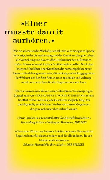 »Ein Pageturner, atemlos gelesen, gefangen im intellektuellen Tornado. Sprachlich und stilistisch brillant.« Marianne Wille, SRF 2 Kultur, 28.03.2025 »Dieser Autor hat eine Syntax im Repertoire, die wohltuend aufwendiger daherkommt als die banale Alltagssprachlichkeit der meisten Gegenwartsromane. All das macht aus 'Verzauberte Vorbestimmung' den ersten Covid-19-Roman der Literaturgeschichte und markiert einen neuen 'State of the Art' im Romanschreiben.« Sigrid Löffler, Falter, 19.02.25 »Lüscher erzählt fast tranceartig von seiner Covid-Erkrankung, einem Maschinenstürmer, dem Schriftsteller Peter Weiss - und der Zukunft. Irrwitzig, labyrinthisch und wirklich groß.« Eva Horn, Jurybegründung SPIEGEL Buchpreis 2025 Top 20 »Eine präzise und zugleich philosophische Reflexion unserer Gegenwart. Und dazu: literarisch brillant.« Wiebke Porombka, Deutschlandfunk, 02.02.25 »Jonas Lüschers neuer, radikal verwilderter Roman ist ein Erwachen ... In jeder Zeile spürt man seinen von einer beinahe tödlichen Erfahrung rasend beschleunigten Herzschlag.« Iris Radisch, Die Zeit, 30.01.25 »Jonas Lüscher meldet sich mit einem Donnerschlag zurück: 'Verzauberte Vorbestimmung' ist ein erzählerischer Triumph. Ein Lebenszeichen nicht nur des lange vermissten Schriftstellers, sondern auch eines Erzählens generell, das politische und philosophische Ansprüche an die Literatur gleichermaßen erfüllt wie das Verlangen nach Form- und Sprachbewusstsein.« Andreas Platthaus, Frankfurter Allgemeine Zeitung, 29.01.25 »Ungemein originell und aufschlussreich, sehr sorgfältig durchdacht und sehr gut geschrieben.« Thomas Strässle, SRF Literaturclub, 28.01.25 »Wenn es einen Roman gegen den galoppierenden Irrsinn der Zeiten braucht, dann diesen. ... Jonas Lüscher hat einen gewaltigen Roman geschrieben, der das Denken wieder ins Nadelöhr des eigenen Lebens fädelt.« Paul Jandl, Neue Zürcher Zeitung, 28.01.25 »Warum hängen unser Glück und unser Leben heute so oft von Technik ab? Jonas Lüscher erzählt mit enormer Sprachmagie davon. Ein erster Höhepunkt im noch jungen Literaturjahr 2025.« Lothar Müller, Süddeutsche Zeitung, 25.01.25
