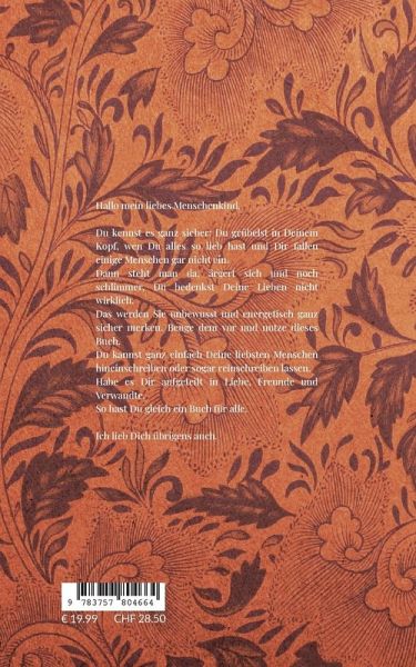 Hallo mein liebes Menschenkind, Du kennst es ganz sicher: Du grübelst in Deinem Kopf, wen Du alles so lieb hast und Dir fallen einige Menschen gar nicht ein. Dann steht man da, ärgert sich und noch schlimmer, Du bedenkst Deine Lieben nicht wirklich.Das werden Sie unbewusst und energetisch ganz sicher merken. Beuge dem vor und nutze dieses Buch. Du kannst ganz einfach Deine liebsten Menschen hineinschreiben oder sogar reinschreiben lassen. Habe es Dir aufgeteilt in Liebe, Freunde und Verwandte. So hast Du gleich ein Buch für alle. Ich lieb Dich übrigens auch. Dein Kindergärtner Benno Hocke