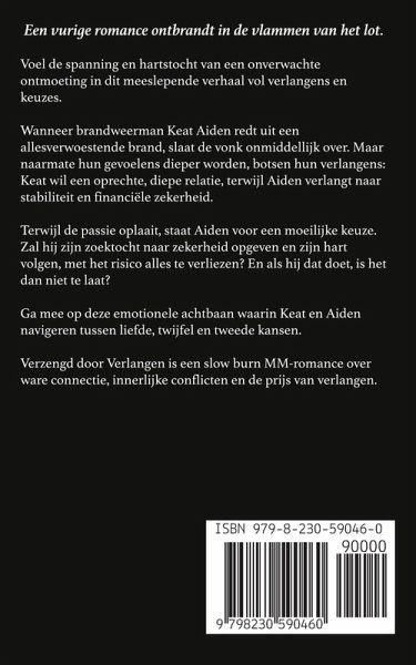 Een vurige romance ontbrandt in de vlammen van het lot. Voel de spanning en hartstocht van een onverwachte ontmoeting in dit meeslepende verhaal vol verlangens en keuzes. Wanneer brandweerman Keat Aiden redt uit een allesverwoestende brand, slaat de vonk onmiddellijk over. Maar naarmate hun gevoelens dieper worden, botsen hun verlangens: Keat wil een oprechte, diepe relatie, terwijl Aiden verlangt naar stabiliteit en financiële zekerheid. Terwijl de passie oplaait, staat Aiden voor een moeilijke keuze. Zal hij zijn zoektocht naar zekerheid opgeven en zijn hart volgen, met het risico alles te verliezen? En als hij dat doet, is het dan niet te laat? Ga mee op deze emotionele achtbaan waarin Keat en Aiden navigeren tussen liefde, twijfel en tweede kansen. Verzengd door Verlangen is een slow burn MM-romance over ware connectie, innerlijke conflicten en de prijs van verlangen.