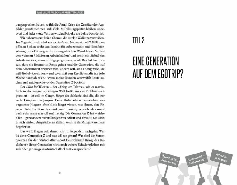 Die grundsätzlich Kernaussage des Buchs ist „Die deutsche Wirtschaft ist auf die junge Generation angewiesen, was heißt, dass Unternehmen gezwungen sind, sich auf Veränderungen einzustellen. Sie müssen reagieren.“ Ja, das unterschreibe ich gleich. Aber auf solche oder ähnliche unverschämten Forderungen einzugehen, halte ich nicht wirklich für sinnvoll. Was kommt dann als Nächstes?