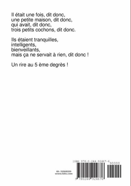 Il était une fois, dit donc, une petite maison, dit donc, qui avait, dit donc, trois petits cochons, dit donc. Ils étaient tranquilles, intelligents, bienveillants, mais ça ne servait à rien, dit donc ! Un rire au 5 ème degrès !