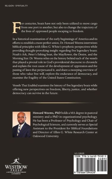 For centuries, boats have not only been utilized to move cargo from one port to another, but also to change the trajectory of the lives of oppressed people escaping to freedom. In a historical examination of the early beginnings of America and its efforts to establish a more perfect union, Dr. Howard Weems intertwines biblical principles with Ellen G. White's prophetic perspectives while providing thought-provoking insight regarding five legendary boats: Noah's Ark, Peter's fishing boat, the Mayflower, the Desire, and the Morning Star. Dr. Weems relies on the history behind each of the vessels that played a pivotal role in God's providential discourse to chronicle and explain the root cause of the development of oppression and the passing of laws that perpetuated it, and share a sweeping overview of those who value free will, explore the endurance of democracy, and examine the fragility of the United States Constitution. Vessels That Enabled examines the history of five legendary boats while offering new perspectives on freedom, liberty, justice, and whether democracy can survive in the future.