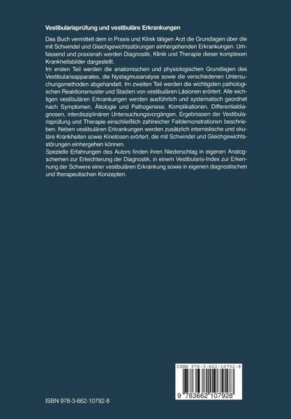 Kurze Geschichte der Vestibularisforschung.- Anatomische und physiologische Grundlagen des vestibulären Systems.- Die Vestibularisprüfung.- Die Schwindelanalyse.- Der Nystagmus.- Die Frenzelbrille.- Die Elektronystagmographie (ENG).- Der Spontannystagmus.- Der Nackenreflex.- Sonderformen des Nystagmus.- Sonderformen von spontanen Augenbewegungen mit abnormen Formen.- Der okuläre Nystagmus.- Die Lageprüfung.- Der Kopfschüttelnystagmus.- Statische Koordinationsprüfungen (vestibulospinale Reaktionen).- Hirnnervenfunktionsprüfungen.- Die kalorische Prüfung.- Untersuchung der Blickmotorik (opto-vestibuläres System) (1 u. 2).- Die Rotationsprüfung.- Die Pendelstuhlprüfung.- Die Parallelschaukel.- Die Gegenrollung der Augen ("ocular counterrolling").- Vestibuläre Erkrankungen.- Einfache Unterscheidungsmerkmale zwischen peripher- und zentral-vestibulären Erkrankungen in der Vestibularisprüfung.- Vestibularismuster von peripher-vestibulären Erkrankungen in Abhängigkeit von Schwindelformen (1-5).- Adaptation.- Habituation.- Vestibuläre Kompensation.- Der Vestibularis-Index.- Morbus Menière.- Neuropathia vestibularis.- Neuropathia vestibularis-ähnliches Syndrom.- Akuter Hörsturz.- Sinugener Schwindel.- Otosklerose.- Schwindel als Folge von otoneurochirurgischen Eingriffen (1 u. 2).- Labyrinthfistel.- Labyrinthitis.- Meningitis, Meningoenzephalitis.- Zoster oticus.- Schwindel als Folge von Schädeltraumen (1-5).- Akustikusneurinom.- Glomus-Tumor.- Der zervikale Schwindel.- Vertebralis-Basilaris-Insuffizienz.- Encephalomyelitis disseminata.- Syringomyelie und Syringobulbie.- Hirnorganische Anfallsleiden.- Psychogener Schwindel.- Schwindel im Kindesalter.- Tullio-Phänomen.- Cogan-Syndrom.- Costen-Syndrom.- Toxische Innenohrschäden.- Schwindel ausinternistischer Sicht.- Okulärer Schwindel.- Kinetosen.- Kurze Erläuterung zur Therapie des Schwindels.- Trainingshinweise für Patienten mit Schwindel.- Verhaltensregeln für Personen mit Schwindel.- Dokumentation von Vestibularisbefunden.- Literatur.