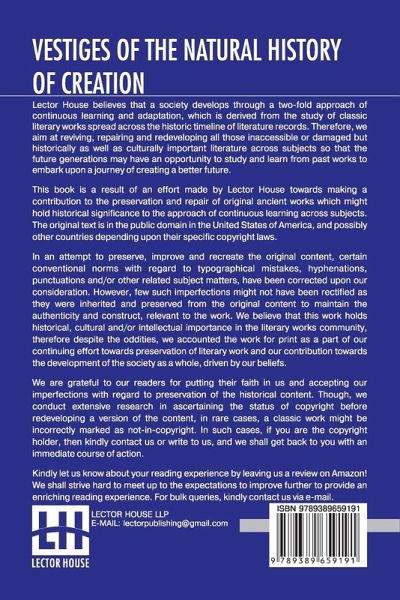 Vestiges Of The Natural History Of Creation This book is a result of an effort made by us towards making a contribution to the preservation and repair of original classic literature. In an attempt to preserve, improve and recreate the original content, we have worked towards: 1. Type-setting & Reformatting: The complete work has been re-designed via professional layout, formatting and type-setting tools to re-create the same edition with rich typography, graphics, high quality images, and table elements, giving our readers the feel of holding a 'fresh and newly' reprinted and/or revised edition, as opposed to other scanned & printed (Optical Character Recognition - OCR) reproductions. 2. Correction of imperfections: As the work was re-created from the scratch, therefore, it was vetted to rectify certain conventional norms with regard to typographical mistakes, hyphenations, punctuations, blurred images, missing content/pages, and/or other related subject matters, upon our consideration. Every attempt was made to rectify the imperfections related to omitted constructs in the original edition via other references. However, a few of such imperfections which could not be rectified due to intentional\unintentional omission of content in the original edition, were inherited and preserved from the original work to maintain the authenticity and construct, relevant to the work. We believe that this work holds historical, cultural and/or intellectual importance in the literary works community, therefore despite the oddities, we accounted the work for print as a part of our continuing effort towards preservation of literary work and our contribution towards the development of the society as a whole, driven by our beliefs. We are grateful to our readers for putting their faith in us and accepting our imperfections with regard to preservation of the historical content. HAPPY READING!