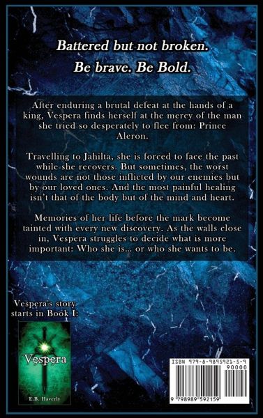 Battered and betrayed, Vespera has become what she always feared- a burden. Pursuing revenge against the Bloodied Men in Caneesho only uncovered more questions than answers. Why would King Karrolei plot against Rokellia? Why does he desperately need an army when the kingdoms are at peace? And the most important question- What are the Genmari? Vespera turns her sights east to Jahilta, the capital of the kingdom of Rokellia, where Prince Aleron has promised refuge and resolutions. But the journey is long and she must revisit her old haunts: the Nitalla Forest, Rogue City, and Ameris.The slices King Karrolei left on her body are deep but the worst wounds have yet to come. Sometimes, it isn't just the daggers and swords wielded by the enemy that leave the lasting scars, but the words and actions of loved ones that rend us to pieces. And the most painful healing isn't that of the body but of the mind and heart. Memories of her life before the bladed crest become tainted with every new discovery. As the air grows too thick and the walls close in, Vespera struggles to decide what is more important: Who she is or who she wants to be.