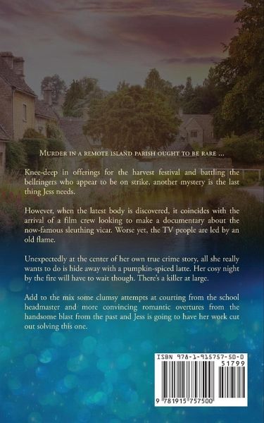 Murder in a remote island parish ought to be rare ... Knee-deep in offerings for the harvest festival and battling the bellringers who appear to be on strike, another mystery is the last thing Jess needs. However, when the latest body is discovered, it coincides with the arrival of a film crew looking to make a documentary about the now-famous sleuthing vicar. Worse yet, the TV people are led by an old flame. Unexpectedly at the center of her own true crime story, all she really wants to do is hide away with a pumpkin-spiced latte. Her cosy night by the fire will have to wait though. There's a killer at large. Add to the mix some clumsy attempts at courting from the school headmaster and more convincing romantic overtures from the handsome blast from the past and Jess is going to have her work cut out solving this one.