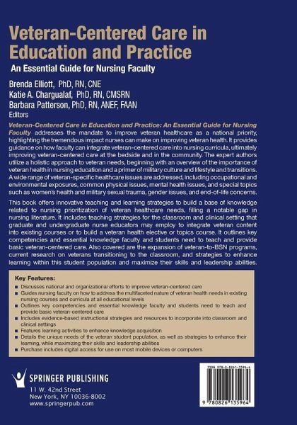 Veteran-Centered Care in Education and Practice: An Essential Guide for Nursing Faculty addresses the mandate to improve veteran healthcare as a national priority, highlighting the tremendous impact nurses can make on improving veteran health. It provides guidance on how faculty can integrate veteran-centered care into nursing curricula, ultimately improving veteran-centered care at the bedside and in the community. The expert authors utilize a holistic approach to veteran needs, beginning with an overview of the importance of veteran health in nursing education and a primer of military culture and lifestyle, and transitions. A wide range of veteran-specific healthcare issues are addressed, including occupational and environmental exposures, common physical-related issues, mental-health issues, and special topics such as women's health and military sexual trauma, gender issues, and end-of-life concerns. ; This book offers innovative teaching and learning strategies to build a base of knowledge related to nursing prioritization of veteran health care needs, filling a notable gap in nursing literature. It includes teaching strategies for the classroom and clinical setting that graduate/undergraduate nurse educators may employ to integrate veteran content into existing courses or to build a Veteran Health elective or topics course. It outlines key competencies and essential knowledge faculty and students need to teach and provide basic veteran-centered care. Also covered are the expansion of Veteran-to-BSN programs, current research on veterans transitioning to the classroom, and strategies to enhance learning within this student population and maximize their skills and leadership abilities. Key Features: Discusses national and organizational efforts to improve veteran-centered care Guides nursing faculty on how to address the multifaceted nature of veteran health needs in existing nursing courses and curricula at all educational levels Outlines key competencies and essential knowledge faculty and students need to teach and provide basic veteran-centered care Includes evidence-based instructional strategies and resources to incorporate into classroom and clinical settings Features learning activities to enhance knowledge acquisition Details the unique needs of the veteran student population, as well as strategies to enhance their learning, while maximizing their skills and leadership abilities Purchase includes access to the ebook for use on most mobile devices or computers