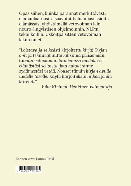 Opas siihen, kuinka parannat merkittävästi elämänlaatuasi ja saavutat haluamiasi asioita elämässäsi yhdistäen vetovoiman lain neuro-lingvistisen ohjelmoinnin, NLP:n, tekniikoihin. Uskoitpa sitten vetovoiman lakiin tai et. "Loistava ja selkeästi kirjoitettu kirja! Kirjan opit ja tekniikat auttavat sinua pääsemään linjaan vetovoiman lain kanssa luodaksesi elämästäsi sellaista, jota haluat sinne sydämestäsi vetää. Nouset tämän kirjan avulla uudelle tasolle. Käytä harjoituksiin aikaa ja älä kiirehdi." Juha Kivinen, Henkinen valmentaja