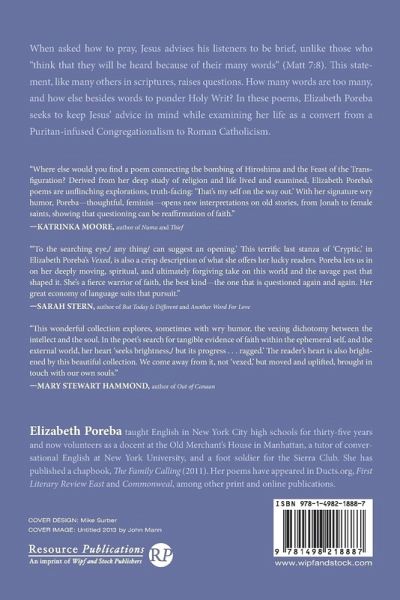 When asked how to pray, Jesus advises his listeners to be brief, unlike those who ""think that they will be heard because of their many words"" (Matt 7:8). This statement, like many others in scriptures, raises questions. How many words are too many, and how else besides words to ponder Holy Writ? In these poems, Elizabeth Poreba seeks to keep Jesus' advice in mind while examining her life as a convert from a Puritan-infused Congregationalism to Roman Catholicism. ""Where else would you find a poem connecting the bombing of Hiroshima and the Feast of the Transfiguration? Derived from her deep study of religion and life lived and examined, Elizabeth Poreba's poems are unflinching explorations, truth-facing: 'That's my self on the way out.' With her signature wry humor, Poreba--thoughtful, feminist--opens new interpretations on old stories, from Jonah to female saints, showing that questioning can be reaffirmation of faith."" --Katrinka Moore, author of Numa and Thief ""'To the searching eye,/ any thing/ can suggest an opening.' This terrific last stanza of 'Cryptic,' in Elizabeth Poreba's Vexed, is also a crisp description of what she offers her lucky readers. Poreba lets us in on her deeply moving, spiritual, and ultimately forgiving take on this world and the savage past that shaped it. She's a fierce warrior of faith, the best kind--the one that is questioned again and again. Her great economy of language suits that pursuit. --Sarah Stern, author of But Today Is Different and Another Word For Love ""This wonderful collection explores, sometimes with wry humor, the vexing dichotomy between the intellect and the soul. In the poet's search for tangible evidence of faith within the ephemeral self, and the external world, her heart 'seeks brightness,/ but its progress . . . ragged.' The reader's heart is also brightened by this beautiful collection. We come away from it, not 'vexed,' but moved and uplifted, brought in touch with our own souls."" --Mary Stewart Hammond, author of Out of Canaan Elizabeth Poreba taught English in New York City high schools for thirty-five years and now volunteers as a docent at the Old Merchant's House in Manhattan, a tutor of conversational English at New York University, and a foot soldier for the Sierra Club. She has published a chapbook, The Family Calling (2011). Her poems have appeared in Ducts.org, First Literary Review East and Commonweal, among other print and online publications.