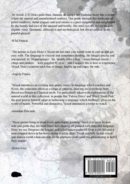 In Vexed - Z D Dicks' electrifying new collection, a series of unexpected protagonists face dramatic challenges (a Bodhisattva learns to let go, Diogenes looks at a cynical world, Achilles hears his dead lover), and the human condition, with all it's trials and tribulations, longings and aversions, fears and excitements are explored in a series of richly lyrical and vividly imagined poems. Dicks takes the reader into fantastical, yet convincing worlds to explore our darkest secrets and inner conflicts - in Black Tooth Fish there is the sometimes tortuous nature of desire, death is examined in Blossom, in Buffet a disaster benefits those who aren't the victims, in Doppelgänger - the protagonist comes to terms with the painful experience of being ghosted, Owl Rising - is an exuberant giving into to the lack of control we experience in life and The Loaded Gun details a quasi-sexual attitude to violence. This is an unflinching and clearsighted collection, in which our most intimate concerns are explored and addressed head on, in charged, beautifully wrought and fiercely original poems. These are poems which address the perhaps irresolvable conflicts, questions and dilemmas in our life - this is a book for anyone who has ever felt vexed. 'In Vexed, Z D Dicks pulls titan, shaman, alchemist and fantastic beast into a realm where the natural and manufactured coalesce. Our guide through this landscape of petrol rainbows, metal tongues and acid storms is a poet enraptured and enlightened by the beauty and awe of the unusual and terrific. His strict eye always on his deft organic verse; Germanic, alliterative and mythological, but always placed in the painful present'. -R M Francis 'The poems in Zack Dicks's Vexed are not ones you would want to curl up and get cosy with. The language is visceral and sometimes startling, the images precise and unexpected. In 'Doppelgänger', his 'double rides a hog roars through streets / chugs and judders with goggled fly eyes'; and I suspect this is how to experience Vexed. Don't examine each line or image, buckle up and enjoy the ride.' -Angela France 'Vexed introduces an exciting new poetic voice. In language which crackles and fizzes, the collection offers us a range of subjects, drawing on everything from Brexit-era Britain to Classical myth. I'm particularly taken with explorations of the natural world in this collection: in poems like 'Falcon Drive' and 'Black Tooth Fish, ' the poet proves himself adept at fashioning a language which thrillingly gives us the world of beasts. Powerful and distinctive, Vexed announces a writer to watch.' -Jonathan Edwards 'These poems bring to mind every apocalyptic painting I have ever seen. In dark reds and golds they are bone black-box theatres all painted with muscular language. Here, we see Diogenes the beggar, pull a half-eaten sandwich from a city bin and a man stripped down to his bones being eyed by dogs. Tread carefully in this vexed and shaken world when one trip on the platform could send you plummeting to hell's fiery tarpits' -Helen Ivory