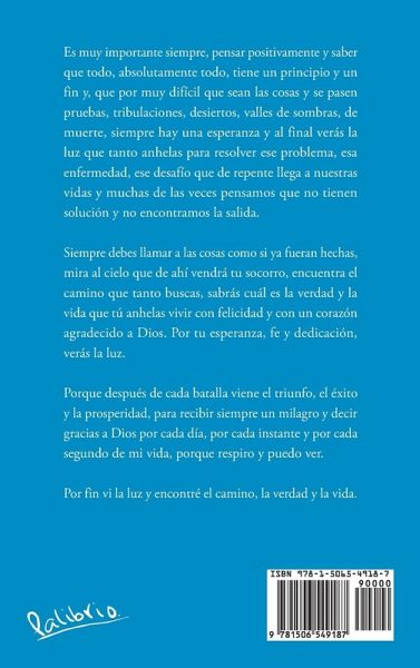 Es muy importante siempre, pensar positivamente y saber que todo, absolutamente todo, tiene un principio y un fin y, que por muy difícil que sean las cosas y se pasen pruebas, tribulaciones, desiertos, valles de sombras, de muerte, siempre hay una esperanza y al final verás la luz que tanto anhelas para resolver ese problema, esa enfermedad, ese desafío que de repente llega a nuestras vidas y muchas de las veces pensamos que no tienen solución y no encontramos la salida. Siempre debes llamar a las cosas como si ya fueran hechas, mira al cielo que de ahí vendrá tu socorro, encuentra el camino que tanto buscas, sabrás cuál es la verdad y la vida que tú anhelas vivir con felicidad y con un corazón agradecido a Dios. Por tu esperanza, fe y dedicación, verás la luz. Porque después de cada batalla viene el triunfo, el éxito y la prosperidad, para recibir siempre un milagro y decir gracias a Dios por cada día, por cada instante y por cada segundo de mi vida, porque respiro y puedo ver. Por fin vi la luz y encontré el camino, la verdad y la vida.