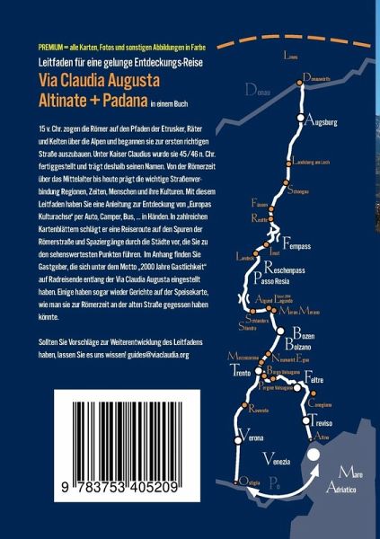 Via Claudia Augustamit Auto, Camper, Bus, ..."Altinate" und "Padana" in einem Buch+ GPX-Track auf www.viaclaudia.orgDonauwörth - Lech - Augsburg - Landsberg am Lech - Schongau - Allgäu - Füssen - Reutte - Tiroler Zugspitz - Fernpass - Gurgltal - Imst - Inntal - Landeck - Tiroler Oberland - Reschenpass - Vischgau - Meran - Burgrafenamt - Bozen - Südtiroler Weinstraße - Piana Rotaliana - TrentoVariante "ALTINATE": - Valsugana - Hochtal Tesino - Nationalpark Dolomiti Bellunesi - Feltre - Valbelluna - Prosecco Weinstraße - Weinstraße Montello und Colli Asolani - Treviso - Sile-Naturpark - Altino - venetianische Lagune - Venedig - JesoloVarinate "PADANA": - Vallagarina - Rovereto - Gardasee - Valpolicella - Verona - Po-Ebene - Ostiglia am PoLeitfaden für eine gelungene Entdeckungs-ReisePREMIUM = alle Seiten bis auf Stadtpläne und Textseiten in Farbe(alternativ gibt es auch ECONOMY = Karten in Farbe, Stadtpläne und andere Seiten in schwarz-weiß, BUDGET = schwarz-weiss)Herzstück des Reiseführers sind die 62 farbige Karten im Format 1:50:000 und 14 noch detaillierteren Karten der Städte mit einem idealen Rundweg. Die kurze geschichtliche Einleitung und über 500 Fotos und andere Abbildungen dienen der Einstimmung auf die ReiseIm Anhang des Radtourenbuches findet sich eine Zusammenstellung von 200 ausgewählten Gastgebern, mit Angabe der Karte, in der Sie sie sie ebenfalls finden.Die Route für Auto, Camper, Bus, usw. führt auf malerischen Landstraßen und romantischen Bergstraßen, durch interessante Orte und Städte mit vielen Sehenswürdigkeiten, und besticht mit ihrer großen Vielfalt:Alle paar Kilometer eine neue Landschaft3 Länder, 2 Spracheneine Vielzahl von unterschiedlichen Kulturen3 KlimazonenEnde April, Anfang Mai kann man sogar mitunter 3 Jahreszeiten erleben: Ein letztes Schneefeld an einer schattigen Stelle am Fernpass, Sonnenbaden ganz im Süden und alle Schattierungen des Frühjahres unterwegsIm Herbst kann man die frisch geernteten Köstlichkeiten entdecken,die entlang der Route in großer Vielfalt wachsen und zu Spezialitäten verarbeitet werdenhttps://www.viaclaudia.org/radtour/detaillierte-routen-beschreibung-padana.htmlDie Via Claudia Augusta folgt der ersten europaverbindenden Straße über die Alpen, zu der die Römer die Wege der Etrusker, Veneter, Räte