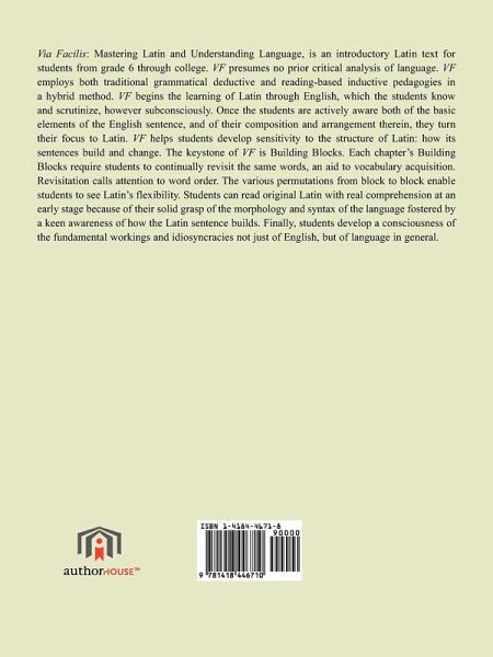 Via Facilis: Mastering Latin and Understanding Language, is an introductory Latin text for students from grade 6 through college. VF presumes no prior critical analysis of language. VF employs both traditional grammatical deductive and reading-based inductive pedagogies in a hybrid method. VF begins the learning of Latin through English, which the students know and scrutinize, however subconsciously. Once the students are actively aware both of the basic elements of the English sentence, and of their composition and arrangement therein, they turn their focus to Latin. VF helps students develop sensitivity to the structure of Latin: how its sentences build and change. The keystone of VF is Building Blocks. Each chapter's Building Blocks require students to continually revisit the same words, an aid to vocabulary acquisition. Revisitation calls attention to word order. The various permutations from block to block enable students to see Latin's flexibility. Students can read original Latin with real comprehension at an early stage because of their solid grasp of the morphology and syntax of the language fostered by a keen awareness of how the Latin sentence builds. Finally, students develop a consciousness of the fundamental workings and idiosyncracies not just of English, but of language in general.
