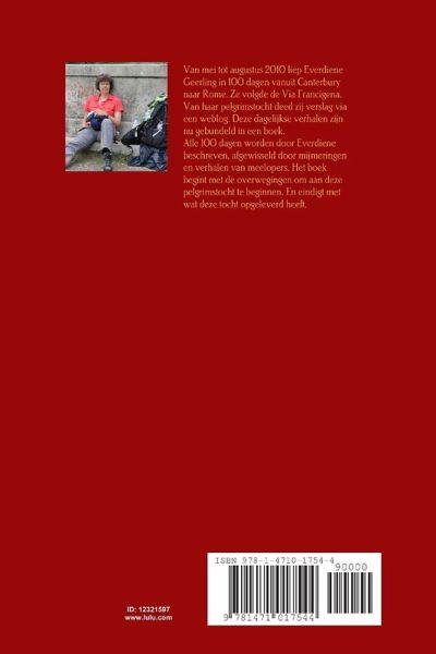 Van mei tot augustus van 2010 liep Everdiene Geerling in 100 dagen vanuit Canterbury naar Rome. Ze volgde de Via Francigena. Van haar pelgrimstocht deed zij verslag via een weblog. Deze dagelijkse verhalen zijn nu gebundeld in een boek. Alle 100 dagen worden door Everdiene beschreven, afgewisseld door mijmeringen en de verhalen van meelopers. Het boek begint met de overwegingen om aan deze pelgrimstocht te beginnen. En eindigt met wat deze tocht opgeleverd heeft.
