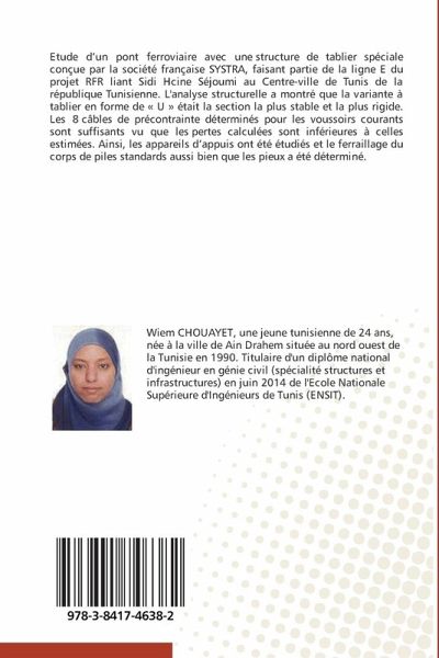 Etude d'un pont ferroviaire avec une structure de tablier spéciale conçue par la société française SYSTRA, faisant partie de la ligne E du projet RFR liant Sidi Hcine Séjoumi au Centre-ville de Tunis de la république Tunisienne. L'analyse structurelle a montré que la variante à tablier en forme de " U " était la section la plus stable et la plus rigide. Les 8 câbles de précontrainte déterminés pour les voussoirs courants sont suffisants vu que les pertes calculées sont inférieures à celles estimées. Ainsi, les appareils d'appuis ont été étudiés et le ferraillage du corps de piles standards aussi bien que les pieux a été déterminé.