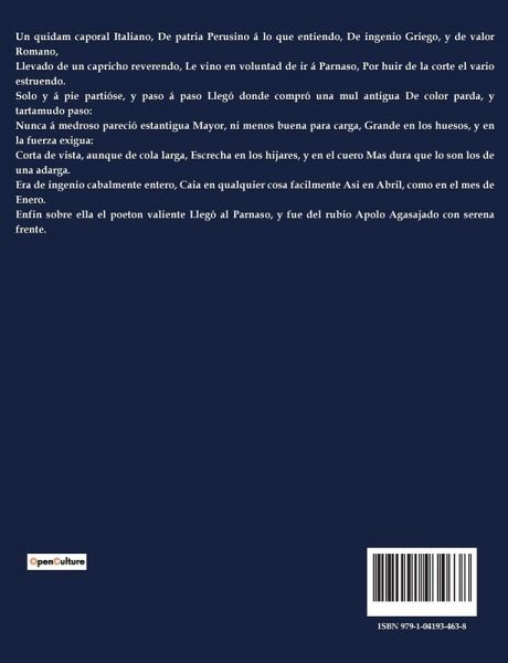 Un quidam caporal Italiano, De patria Perusino á lo que entiendo, De ingenio Griego, y de valor Romano, Llevado de un capricho reverendo, Le vino en voluntad de ir á Parnaso, Por huir de la corte el vario estruendo. Solo y á pie partióse, y paso á paso Llegó donde compró una mul antigua De color parda, y tartamudo paso: Nunca á medroso pareció estantigua Mayor, ni menos buena para carga, Grande en los huesos, y en la fuerza exigua: Corta de vista, aunque de cola larga, Escrecha en los hijares, y en el cuero Mas dura que lo son los de una adarga. Era de ingenio cabalmente entero, Caia en qualquier cosa facilmente Asi en Abril, como en el mes de Enero. Enfin sobre ella el poeton valiente Llegó al Parnaso, y fue del rubio Apolo Agasajado con serena frente.