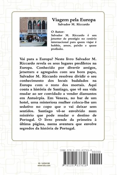 Vai para a Europa? Neste livro Salvador M. Riccardo revela os seus lugares prediletos na Europa. Conhecido por divertir amigos, jetsetters e agregados com seu bom papo, Salvador M. Riccardo resolveu dividir o seu conhecimento dos locais badalados na Europa com o resto dos mortais. Aqui conta a história de Santiago, que vê sua vida mudar ao ser convidado a vender diamantes em Antuérpia. Em Veneza, no bar de um hotel, uma misteriosa mulher coloca-lhe um sedativo no copo que o vai deixar sem sentidos. Santiago vê-se envolvido num mistério que pode mudar o destino de Portugal. O livro prende da primeira à última página, numa aventura que envolve segredos da história de Portugal. O livro é também um guia particular com muitas dicas para quem está planejando viajar na Europa, principalmente a turma mais jovem e a classe emergente, que quer descobrir as marcas de luxo. Não leve um século para entender como vive um jetsetter na Europa!