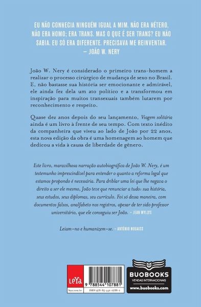 A corajosa jornada do homem que se tornou símbolo da liberdade de gênero no Brasil Viagem solitária, livro que narra a corajosa jornada de um dos maiores símbolos da liberdade de gênero, chega em nova edição que homenageia a força e a trajetória de seu autor, João W. Nery (1950-2018), que, em 1977, foi o primeiro trans-homem a realizar uma cirurgia de redesignação sexual no Brasil. Quase dez anos depois do seu lançamento, ainda é um livro à frente de seu tempo. ¿Eu não conhecia ninguém igual a mim. Não era hétero, não era homo, era trans. Mas o que é ser trans? Eu não sabia. Eu só era diferente. Precisava me reinventar¿, escreveu João. Seu livro, uma obra tecida com dor e com coragem que anuncia um mundo menos solitário para aqueles que não se enquadram entre as maiorias, é uma história de incompreensão, superação, autoafirmação, coragem e generosidade de um homem nascido preso a um corpo de mulher que, no fim, contra tudo e todos, se torna pai e ícone. Escritor e ativista pelos direitos LGBT, João W. Nery renunciou à carreira de psicólogo e professor universitário quando, adotando uma identidade falsa, decidiu lutar para poder ser aceito e respeitado como homem. E, não bastasse sua vida ser emocionante e admirável, ele ainda fez dela um ato político e se arriscou inúmeras vezes em prol da causa trans. Após a primeira edição de Viagem solitária, em 2011, João tornou-se referência nacional como ativista dos direitos humanos e pelo reconhecimento do transexual perante a sociedade e a justiça. Seu nome batiza o Projeto de Lei de Identidade de Gênero, proposta em 2013 pelos deputados Jean Wyllys e Erika Kokay. Sua luta segue hoje nas mãos de sua esposa, seu filho e milhares de transexuais espalhados pelo Brasil. Viagem solitária é uma leitura sensível e comovente para todos aqueles que prezam pela liberdade e a diversidade ¿ parte da essência da natureza humana. Como escreveu o mestre Antônio Houaiss, ¿leiam-no e humanizem-se¿. A nova edição, revista, conta com apresentação inédita de Sheila Salewski, viúva do autor. ¿Maravilhosa narração autobiográfica... testemunho imprescindível... Para driblar uma lei que lhe negava o direito de ser ele mesmo, João teve que renunciar a tudo.¿ ¿ Jean Wyllys, professor universitário e ex-deputado federal ¿João W. Nery é uma referência nacional não só por ter sido o primeiro trans-homem do Brasil (como aparece na mídia), mas também por sua generosidade e sua coragem em compartilhar sua experiência singular, mostrando-nos que é possível sermos o que desejamos, sem cedermos às constrições sociais que nos são impostas pela sociedade e pela cultura.¿ ¿ Simone Ávila, pesquisadora em identidades de gênero e subjetividades