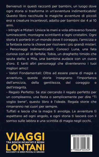 Benvenuti in questi racconti per bambini, un luogo dove ogni storia si trasforma in un'avventura indimenticabile! Questo libro racchiude le magiche avventure di piccoli eroi e creature incantevoli, adatto per bambini dai 4 ai 10 anni. - Intrighi e Misteri: Unisce le mani e vola attraverso foreste luminescenti, montagne scintillanti e laghi cristallini. Ogni storia ti porterà in un mondo dove il coraggio, l'amicizia e la fantasia sono la chiave per risolvere i più grandi misteri. - Personaggi Indimenticabili: Conosci Luna, una fata curiosa con ali di farfalla; Tobia, un draghetto timido che sputa stelle; e Mila, una bambina audace con un cuore d'oro. E tanti altri personaggi che diventeranno i tuoi migliori amici! - Valori Fondamentali: Oltre ad essere piene di magia e avventura, queste storie insegnano l'importanza dell'amicizia, della gentilezza, del coraggio e dell'integrità. - Regalo Perfetto: Se stai cercando il regalo perfetto per un compleanno, una festa o semplicemente per dire "Ti voglio bene", questo libro è l'ideale. Regala storie che rimarranno nei cuori per sempre. Tuffati e lascia che la magia ti avvolga. Le avventure ti aspettano ad ogni angolo, e ogni storia ti lascerà con il sorriso sulle labbra e una scintilla di magia negli occhi.