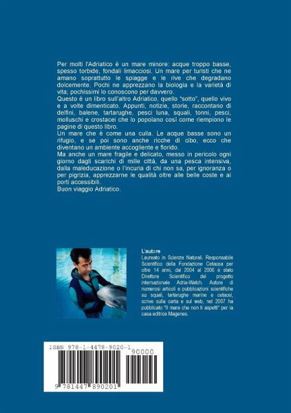 Per molti l'Adriatico è un mare minore: acque troppo basse, spesso torbide, fondali limacciosi. Un mare per turisti che ne amano soprattutto le spiagge e le rive che degradano dolcemente. Pochi ne apprezzano la biologia e la varietà di vita; pochissimi lo conoscono per davvero. Questo è un libro sull'altro Adriatico, quello "sotto", quello vivo e a volte dimenticato. Appunti, notizie, storie, raccontano di delfini, balene, tartarughe, pesci luna, squali, tonni, pesci, molluschi e crostacei che lo popolano così come riempiono le 233 pagine di questo libro. Un mare che è come una culla. Le acque basse sono un rifugio, e se poi sono anche ricche di cibo ecco che diventano un ambiente accogliente e florido. Ma anche un mare fragile e delicato, messo in pericolo ogni giorno dagli scarichi di mille città, da una pesca intensiva, dalla maleducazione o l'incuria di chi non sa, per ignoranza o per pigrizia, apprezzarne le qualità oltre alle belle coste e ai porti accessibili. Buon viaggio Adriatico.