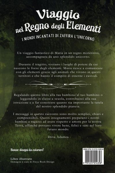Perché leggere questa favola Un viaggio fantastico di Maria in un regno misterioso, accompagnata da uno splendido unicorno. Durante il tragitto, visitano i luoghi di potere da cui nascono le forze degli elementi. Maria riesce a comunicare con gli elementi grazie agli animali che vivono in questi territori e che hanno il compito di esserne i custodi. Questa favola insegna una grande lezione per tutti, bambini e adulti. Lo scopo di questa storia è comprendere e diventare consapevoli dell'importanza che la natura e l'ecologia hanno nella nostra vita. Questo racconto contiene messaggi di amore e rispetto per l'ambiente, questi messaggi sono molto semplici, chiari e comprensibili. Preparano i nostri bambini e ragazzi ad avere rispetto e amore per la nostra Terra, affinché possano vivere bene, felici e sani nel loro mondo futuro. Cosa aspettarsi da questo libroStoria ispiratrice per bambini e ragazzi sull'amore ed il rispetto per il nostro pianeta; Un viaggio misterioso ed emozionante con un magico Unicorno; Stile di scrittura emozionante e realistico. Adatto alla lettura ad alta voce per bambini più piccoli e all'auto-lettura; Belle immagini e una storia che aiuta a comprendere gli elementi e il nostro pianeta. Bonus: disegni da colorare e spazi creativi Alla fine di questo racconto si trovano disegni che i bambini possono divertirsi a colorare. Inoltre, ci sono degli spazi liberi per far sprigionare la loro creatività, i bambini potranno: scrivere, disegnare e creare dei collage a loro piacimento.