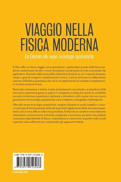 Il libro offre un breve viaggio nel sorprendente e spettacolare mondo della fisica moderna caratterizzato da idee e teorie dirompenti sia dal punto di vista concettuale che applicativo. Partendo dalla teoria della relatività di Einstein in cui i concetti di spazio, tempo e gravità vengono completamente rivisti, si arriva al bizzarro e affascinante universo della fisica quantistica che con le sue applicazioni ha cambiato completamente il nostro modo di vivere. Particolare attenzione è inoltre rivolta ai fondamenti concettuali e ai paradossi della meccanica quantistica grazie ai quali si è sviluppata in tempi più recenti la cosiddetta seconda rivoluzione quantistica, destinata a introdurre nelle nostre vite una nuova generazione di tecnologie quantistiche come computer, crittografia e teletrasporto. Oltre alle nuove tecnologie quantistiche, vengono illustrati in modo semplice e conciso i principi di funzionamento delle più importanti applicazioni della meccanica quantistica che si sono diffuse nella vita quotidiana. Il libro ha un carattere essenzialmente informativo, senza ricorrere a formule complicate o tecnicismi, pertanto non richiede conoscenze approfondite di fisica o matematica; le conoscenze acquisite nella scuola superiore sono sufficienti per comprendere gli argomenti trattati.