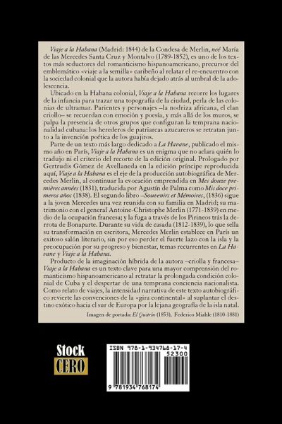 "Viaje a la Habana" (Madrid: 1844) written by the Countess of Merlin, neé María de las Mercedes Santa Cruz y Montalvo, is one of the most seductive texts of Spanish American Romanticism, forerunner of the Caribbean "journey to the source," as it narrates the re-encounter with colonial society from which the author had parted soon after adolescence. Focused on colonial Havana, "Viaje a la Habana" traces the topography of the colonial city, considered the jewel of the overseas Spanish colonies, as the narrator wanders along childhood scenarios remembering relatives and long-lost family members. Merlin's African wet nurse, her uncle Montalvo, mulata divas, Creole women, even commercial agents, are evoked with poetic emotion, while the presence of other groups that compose early Cuban nationality can be felt in the background: portraits of the sugar aristocracy are sketched along with poetic renditions of "guajiros" in the countryside. Part of a longer work dedicated to "La Havane", published the same year in Paris, "Viaje a la Habana" is an editorial enigma as there is no mention of a translator, nor do we know for sure why the Countess chose to cut down the longer French edition. With a foreword and biographical notes by Gertrudis Gomez de Avellaneda, "Viaje a la Habana" is the Countess of Merlin's most important work, continuing the autobiographical production begun with by "Mes douze premières années" (1831), translated by Agustín de Palma as "Mis doce primeros años" (1838). The second memoir, "Souvenirs et Mémoires", (1836) follows young Mercedes reunited once more with her family in Madrid; her marriage with general Antoine-Christophe Merlin (1771-1839) during the French occupation of Spain; and the couple's dramatic escape through the Pyrenees after Bonaparte's defeat. During her married life (1812-1839), Mercedes Merlin establishes a highly successful literary salon in Paris, a role that sparks her transformation into a writer. Despite passing the majority of her adult life in France, Merlin never looses her strong ties to the island and her concern about its progress and welfare, a recurring topic both in "La Havane" and "Viaje a la Habana". Stemming from the author's hybrid imagination as Cuban and French, "Viaje a la Habana" expands our understanding of Spanish American Romanticism, as it reveals the prolonged colonial condition of the island of Cuba at the moment of awakening to a national conscience. As travel writing, this autobiographical text reverts the conventions of the eighteenth-century "grand tour" as it replaces the exoticism of Italian landscape and ruins with the faraway geography of the Caribbean island. In this edition, Professor Adriana Méndez Rodenas underlines the foundational character of the text, adding critical notes and bibliography that helps the modern reader understand and enjoy Mercedes Merlin's delightful prose.