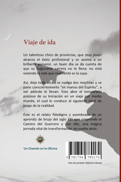 Viaje de Ida, el inesperado diario de un aprendiz de brujo del Siglo XXI. Autor: Santiago Ruiz. Los libros de Un Chamán en la Oficina. ISBN 9781794-780170. Sinopsis: Un talentoso chico de provincias, que muy joven alcanza el éxito profesional y se asoma a un brillante porvenir, un buen día se da cuenta de que su fulgurante carrera no le llena: no está viviendo la vida que realmente es la suya. Así, deja todo atrás, se cuelga dos mochilas y se pone conscientemente "en manos del Espíritu", a ver adónde le llevan. Esto abre el inesperado proceso de su Iniciación en un viaje por medio mundo, el cual le conduce al siguiente nivel de juego de la realidad. Éste es el relato fidedigno y asombrado de un aprendiz de brujo del siglo XXI que emprende el Camino del Guerrero y con ello, una mágica jornada vital de transformación sin vuelta atrás.