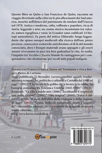 Questo libro su Quito o San Francisco de Quito, racconta un viaggio divertente nella città tra le più affascinanti dei Sud america, inserita nell'elenco del patrimonio da tutelare dall'Unesco nel 1978. Antica e moderna, colta, raffinata e popolare, ricca di storia, leggende e arte; un cosmo storico incastonato tra vulcani, natura rigogliosa e varia: in Ecuador sono codificati 14 biotopi naturalistici. Fa parte del mitico Eldorado: luogo leggendario che spinse europei medievali alla ricerca dell'oro, pietre preziose, conoscenze esoteriche antichissime; al di là del mondo conosciuto, dove i bisogni materiali erano appagati e gli esseri umani vivevanano in pace tra loro godendosi la vita. In realtà, l'impatto tra Vecchio e Nuovo Mondo fu vantaggioso per i conquistadores che sfruttarono per secoli miti popoli indigeni.